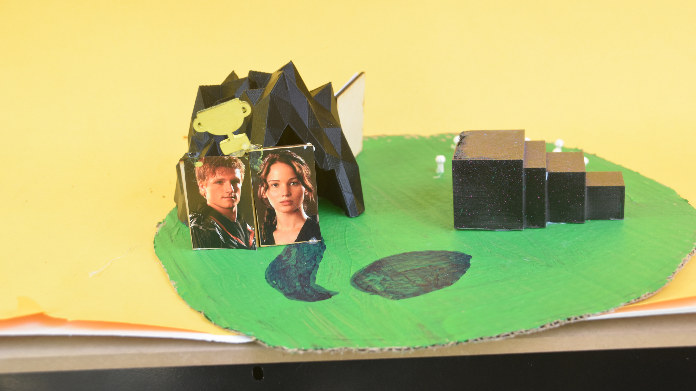 While the cave was my final touch. I glued Peeta and Katniss' pictures to the wood behind them. Then, I laser-cut a trophy and painted it yellow. My final step for that was hot gluing above both their heads as you can see in the picture above.